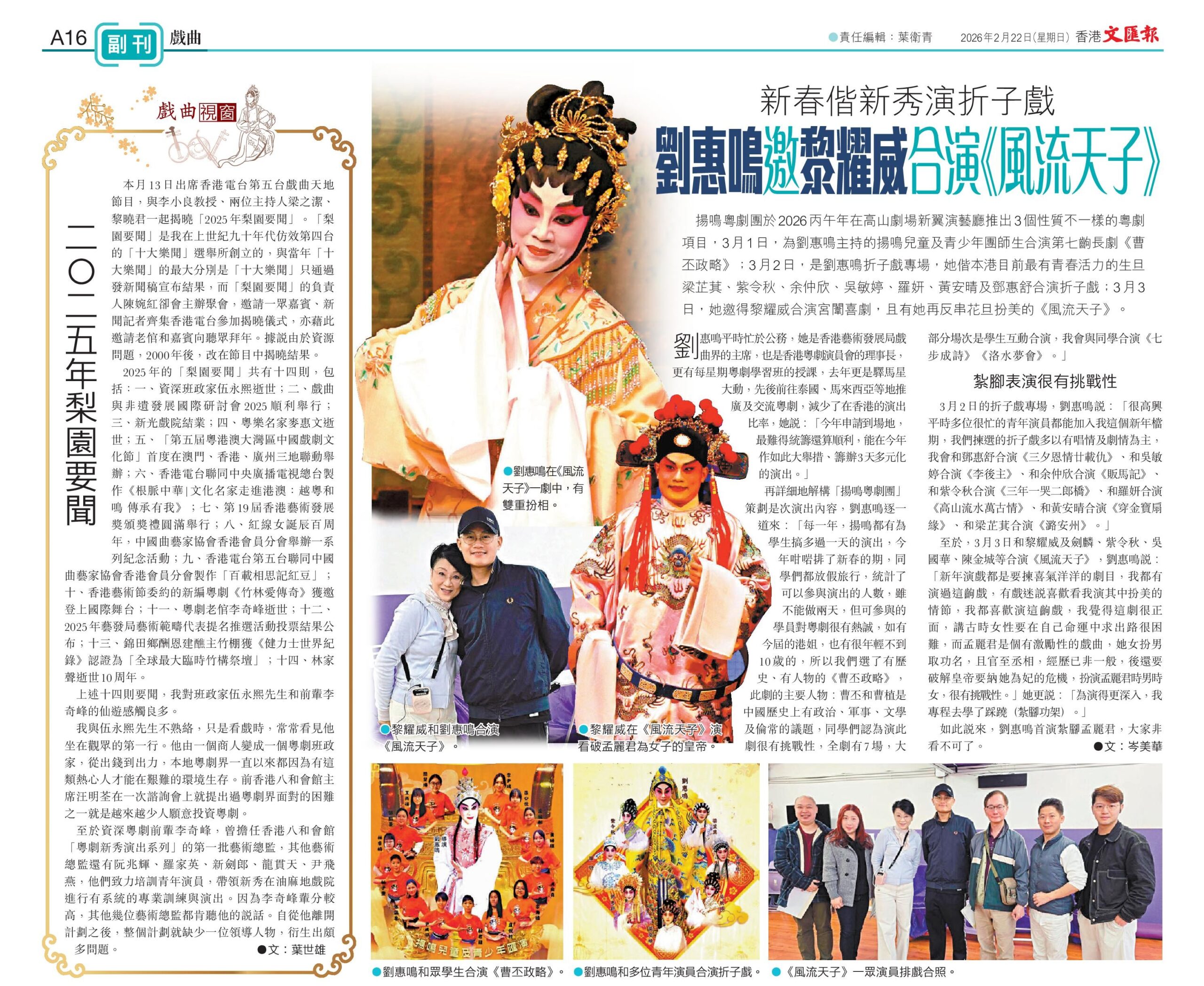 | 新春偕新秀演折子戲 劉惠鳴邀黎耀威合演《風流天子》– 香港文匯網 https://www.wenweipo.com/epaper/wwp/section-h/20260222/2025256855395241984.html ![]() |
