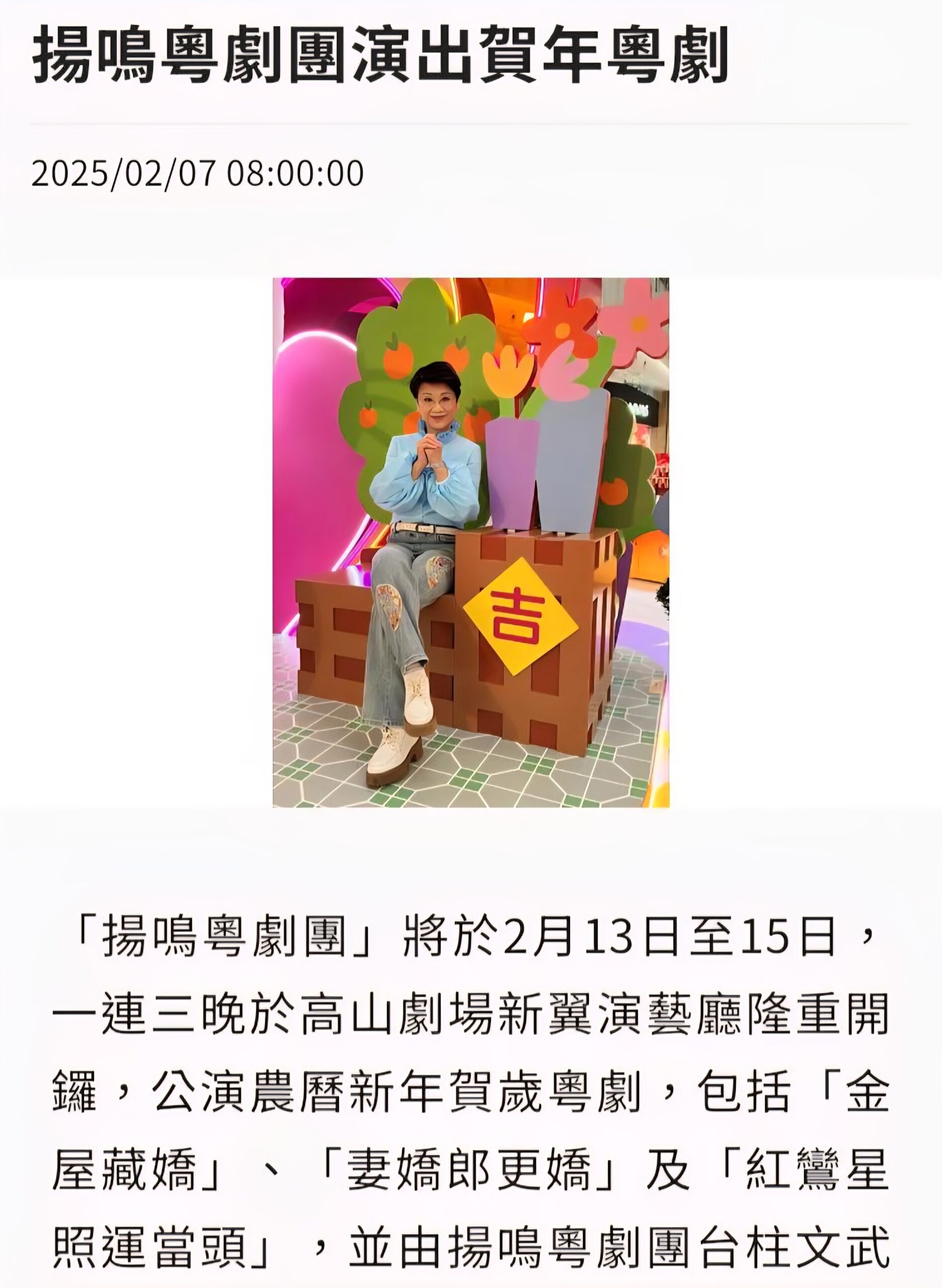 | 2020年4月:抗疫歌曲《 聲聲愛意過萬重 》: 又得到好成績,廣州邀請揚鳴粵劇團協助參與的作品獲中國重視和認同,於國家文化部所屬微信公眾號推發,與其他大師的作品攜手同行。大家可登入: https://mp.weixin.qq.com/s/sMrbTtgL_vmuz2KOMH4KGw |